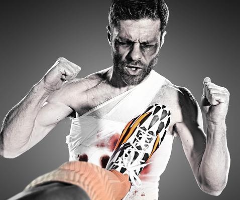 La provocativa imagen muestra a Xabi Alonso con el pecho vendado y ensangrentado recibiendo una patada en el pecho de un futbolista del que solo se aprecia su media naranja, los colores de Holanda. La campaña pretende poner en relieve la determinación de los jugadores poniendo en peligro su integridad física para defender los colores de su país.