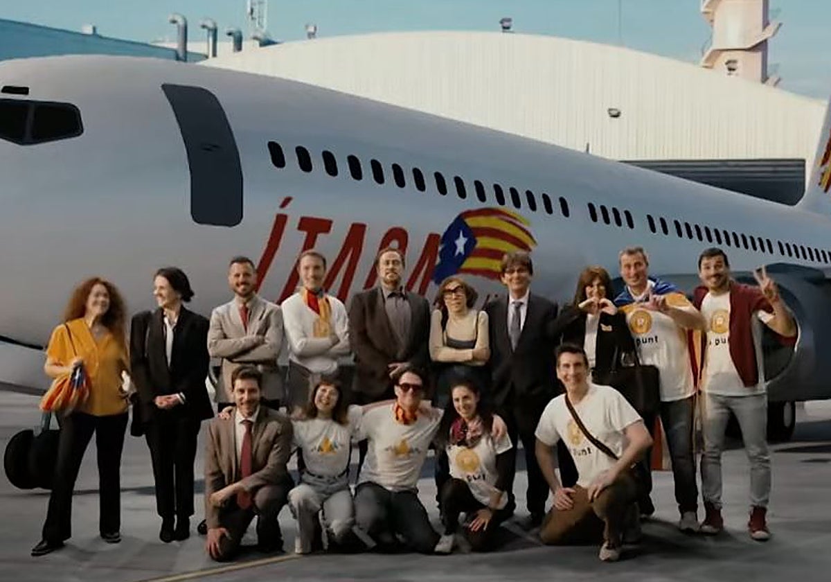 Todos ellos están ve eufóricos en el avión, hasta que empiezan las turbulencias y por los altavoces les piden que se pongan los cinturones porque «no tenemos estructuras de Estado para aterrizar». Puigdemont vaticina que «nos pegaremos una ostia como un piano», mientras que Borràs intenta ser salvada la primera.