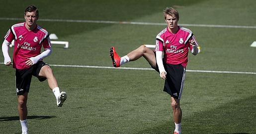 Aquí tenemos al imberbe Odegaard, junto a Kroos, durante el entrenamiento de ayer en Valdebebas