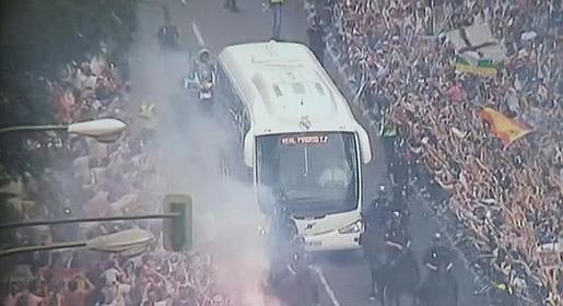Escoltado por la Policía, ya llega el autobús del Real Madrid a las inmediaciones del Bernabéu. Se desata la locura entre los aficionados y se encienden algunas bengalas.El vehículo, que avanza despacio, es saludo por los hinchas. El ambiente es espectacular. AMBIENTAZO ¡¡¡¡ La «quedada» ha vuelto a dar el resultado esperado. ¿Qué pensarán los futbolistas viendo así a sus aficionados?