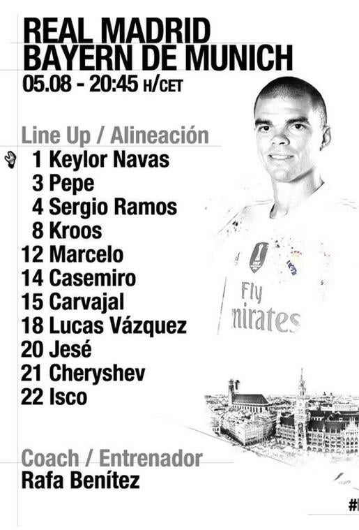 ATENCIÓN ¡¡¡¡ Esta es la alineación que presenta el Real Madrid . Benítez juega ante el Bayern con Keylor; Carvajal, Pepe, Ramos, Marcelo; Kroos, Casemiro; Lucas Vázquez, Isco, Cheryshev y Jesé.