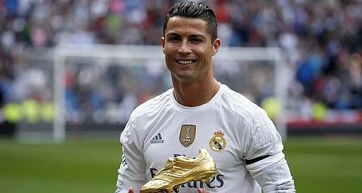 Ya sobre el césped, Cristiano Ronaldo recibe su cuarta bota de oro de manos de Herrerín, y la comparte con todo el Brenabéu.