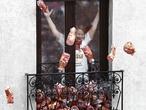 12.02 : La Plaza del Ayuntamiento, teñida de un blanco salpicado por las manchas de vino, s e llena de pañuelos rojos que los visitantes alzan . Por fin empiezan a colocárselos, mientras prorrumpen en aplausos.