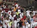 8.00 : Suena el cohete, se abren las puertas de los corrales y los astados salen a la carrera cuesta arriba en Santo Domingo. Dos toros encabezan la manada y se adelantan del resto