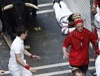 Nuevo balance de heridos: Ha habido siete trasladados al Complejo Hospitalario de Navarra, todos con diversos traumatismos. El neoyorquino B.K.O. de 48 años, sufrió un traumatismo craneal leve en el tramo de Telefónica. La joven de 19 años E.G.C., de Ontinyent (Valencia) también se encontraba en el tramo de Telefónica y tiene traumatismo craneal leve. A.R., un escocés nautral de Paisley de 46 años, también sufre traumatismo craneal leve, aunque resultó herido en Mercaderes. J.C.S. de 38 años y de Leganés (Madrid). ha sido trasladado desde la cuesta de Santo Domingo con una contusión facial leve; I.D.B. de 34 años y de Villamediana de Iregua (La Rioja), desde la calle Estafeta con un traumatismo leve en la rodilla izquierda; J.D.A. de 23 años y de Bilbao, con una herida en la cara sufrida en Telefónica; y por último A.P.P., de 34 años y de Gaucín (Málaga), sufre una luxación de hombro derecho de pronóstico reservado.
