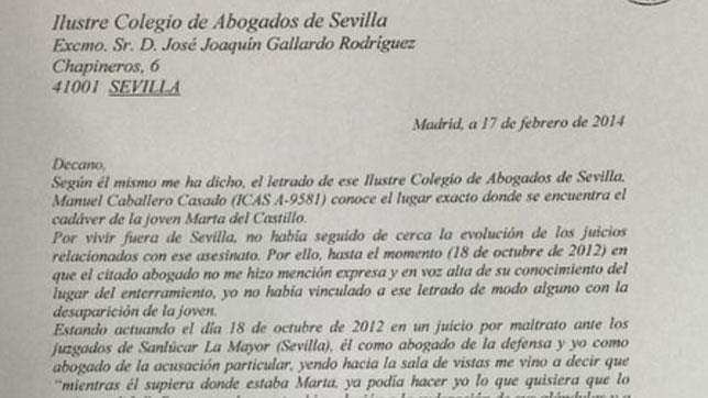 Según una carta enviada por otro letrado, el abogado de Samuel Benítez conocería el paradero del cuerpo de Marta del Castillo. En la misiva, fechada en Madrid el 17 de febrero de 2014, el abogado Íñigo Moreno Lara asegura que Manuel Caballero le dijo que conocía el «lugar exacto» donde se encuentra el cadáver.
