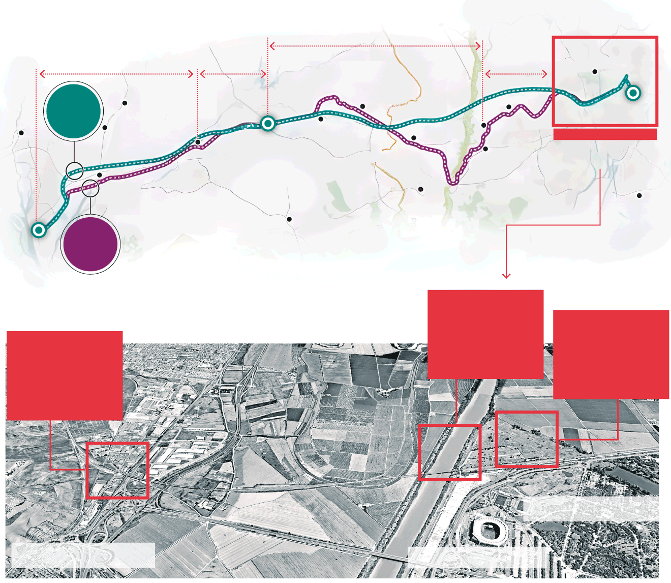 Por su parte, el viaducto del río Guadiamar irá ubicado entre los puntos kilométricos 23,720 y 24,770, dejando un kilómetro en línea recta para salvar el cauce del río por el que el tren avanzará en busca del siguiente tramo hacia La Palma del Condado.