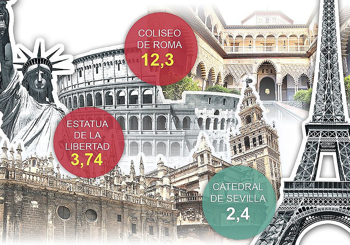 No obstante, no hace falta cruzar el charco para encontrar grandes focos turísticos que jueguen en la misma liga que la Catedral y el Real Alcázar: el Duomo de Milán recibió el pasado año 3 millones de turistas, la abadía francesa del Monte Saint-Michel, 3,4, y la Torre de Pisa, 3,5 millones. Con poco más de 3,7 millones de turistas se alzó la Estatua de la Libertad de la multitudinaria Nueva York, considerada la capital del mundo, menos de millón y medio por encima de los monumentos sevillanos. La Opera House de Sidney se quedó en 1,8 millones de visitas en 2023.