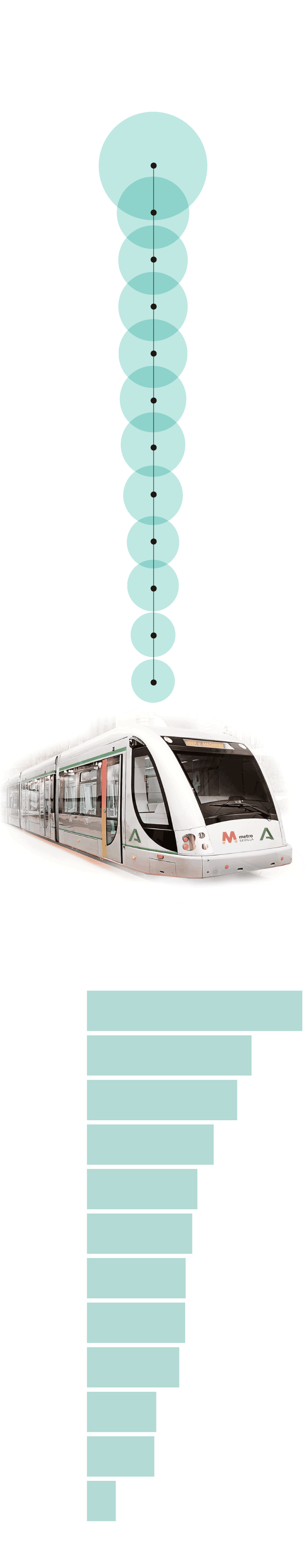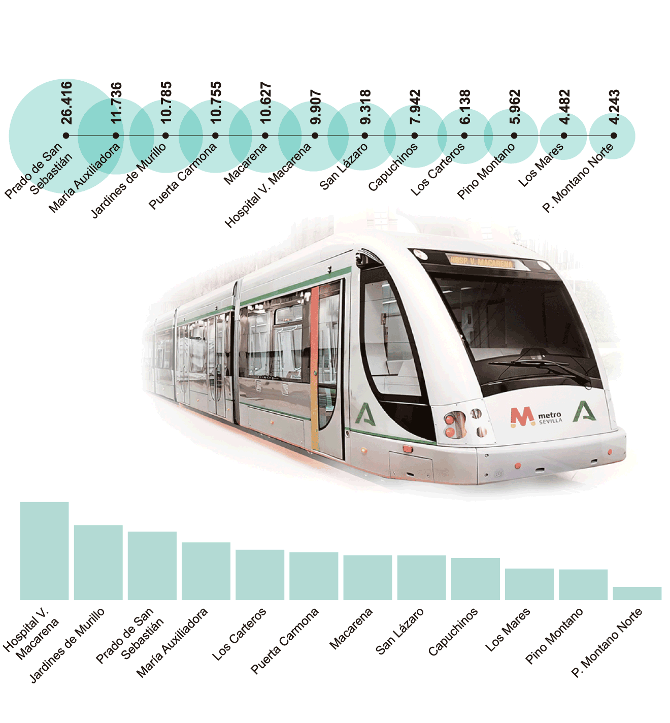 En cuanto al resto de estaciones, el orden de uso lo encabezaría la de María Auxiliadora (11.736 viajeros), seguida de los Jardines de Murillo (10.785), la Puerta de Carmona (10.755) y la Macarena (10.627). El resto hasta llegar a las doce se completa con la del Hospital Macarena (9.907), San Lázaro (9.318), Capuchinos (7.942), Los Carteros (6.138), Pino Montano (5.962) y Los Mares (4.482), la segunda con menos afluencia. La diferencia entre los pasajeros que subirían o bajarían en cada una de ellas es mínima, aunque según se acerque al Centro serían más los que saldrían y viceversa. Es decir, se montarían más cuanto más cerca de Pino Montano.