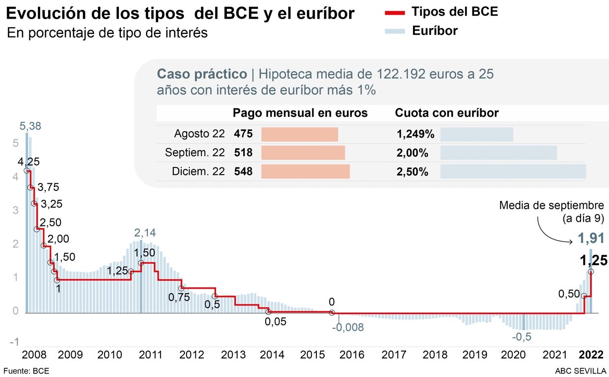La Organización de Consumidores y Usuarios (OCU) hace una estimación para una hipoteca con un capital pendiente de 122.000 euros (una cuantía que se aproxima al promedio del mercado andaluz) a la que le queden pendientes 24 años, referenciada a euribor+1% y que se revise anualmente. Utilizando el euríbor de septiembre, esta familia pagaba pagando un interés de 0.508% y una cuota mensual de unos 450 euros en septiembre de 2021, teniendo en cuenta que el índice en ese momento estaba en el -0,492%. Tras la revisión al alza de los tipos, estimando que el euríbor de septiembre de 2022 cerrará en el 2%, el tipo de interés aplicable pasaría a ser de 3% y la cuota se elevaría hasta los 594 euros, lo que supone 144 euros más que hace un año.