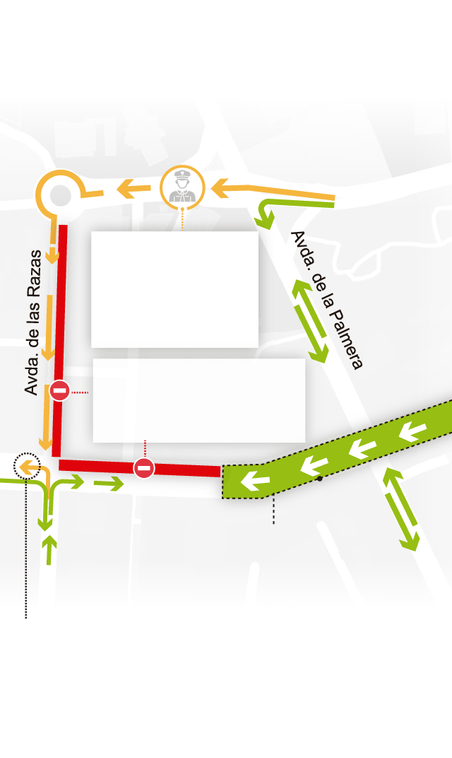 En el conjunto de calles comprendidas en el interior del perímetro delimitado por las calles Santa Fe, Virgen de la Oliva, Avenida Flota de Indias-Avenida, Presidente Adolfo y Suárez-Virgen de Luján tan sólo se permitirá el acceso a los autobuses de Tussam, el servicio público de taxis, los residentes acreditados, los vehículos que, debidamente acreditados, transporten personas de movilidad reducida, vehículos con acreditación de acceso especial, así como bicicletas y motos, estas últimas dependiendo de la vía. Las caballerías sólo tienen autorizado el acceso a través de Virgen del Águila. Las restricciones en esta amplia zona comenzarán el 22 de abril desde las 18.00 horas, con tramos de cierre total al tráfico en distintos horarios.
