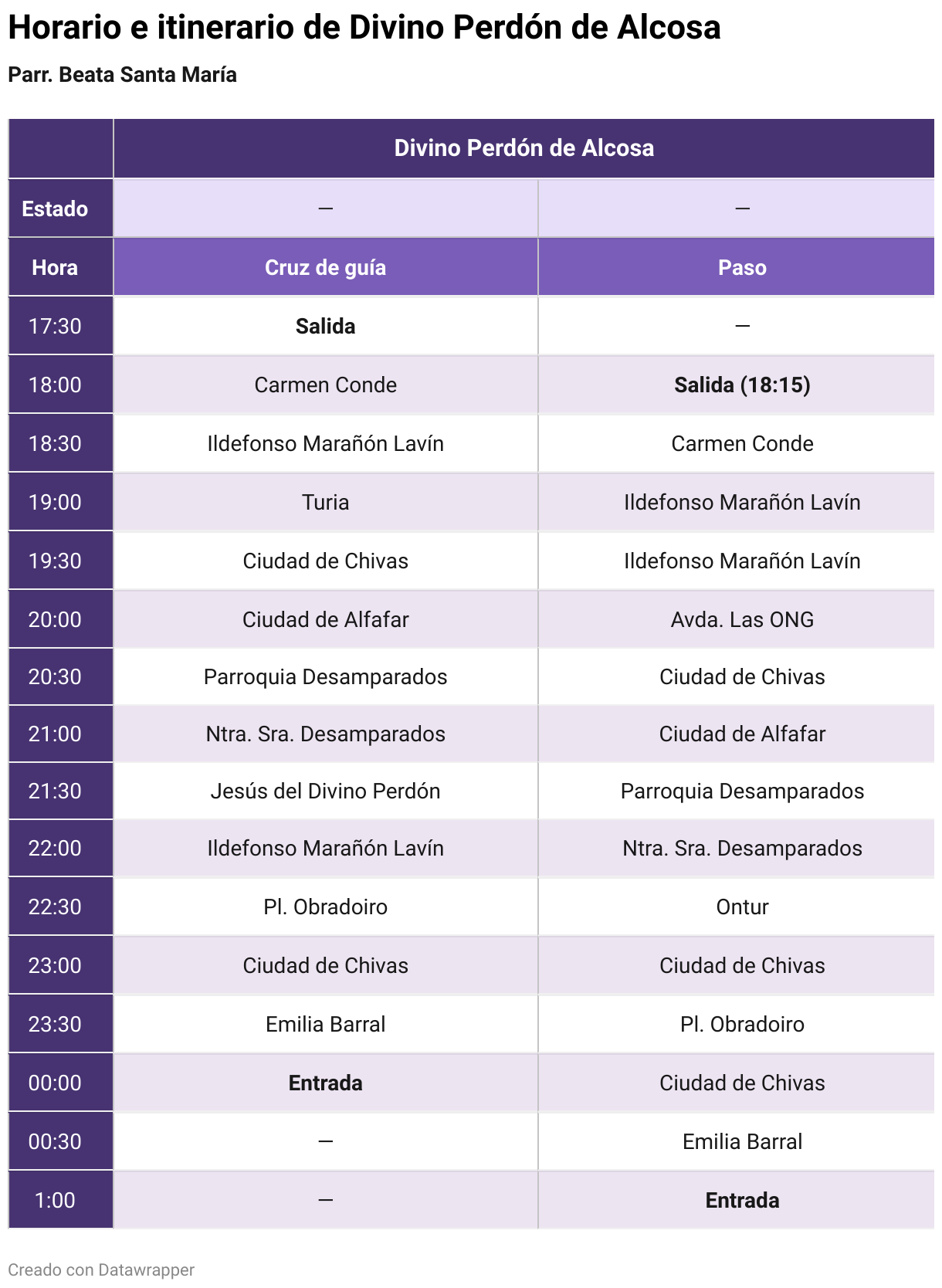 Cabe destacar que la Hermandad del Divino Perdón de Alcosa modifica su recorrido introduciendo la calle Carmen Conde y suprimiendo parte de la calle Escritor Alfonso Grosso. Adelanta su entrada a la 1.00 del Domingo de Ramos.