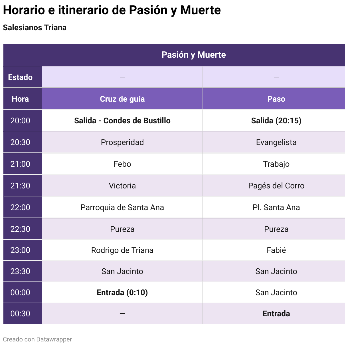 La Hermandad del Santísimo Cristo de Pasión y Muerte es la cofradía de negro del barrio de Triana que realiza su estación de penitencia en la tarde del Viernes de Dolores de la Semana Santa de Sevilla hasta la parroquia de Santa Ana ... . También visitan la capilla del Rocío de Triana, la capilla de los Marineros y la Hermandad de la Estrella. Tienen su sede en la parroquia de Nuestra Señora del Buen Aire, pero la cofradía saldrá desde la parroquia de San Juan Bosco, en los Salesianos de Triana.