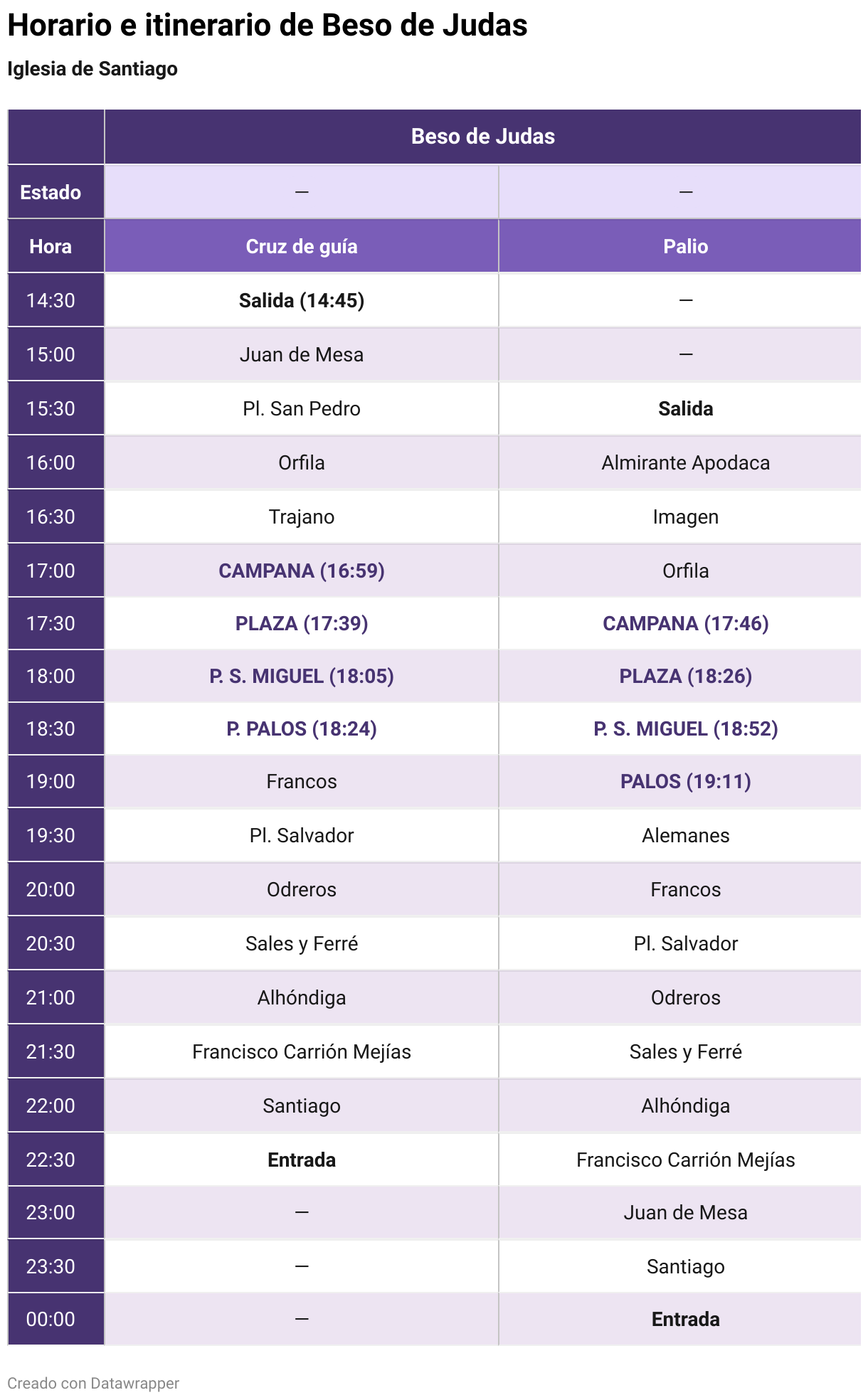 Recorrido: Plaza de Jesús de la Redención, Santiago, Juan de Mesa, Almirante Apodaca, Plaza de San Pedro, Imagen, Plaza de la Encarnación, Laraña, Orfila, Javier Lasso de la Vega, Trajano, Plaza del Duque, CARRERA OFICIAL, Cardenal Carlos Amigo, Alemanes, Álvarez Quintero, Argote de Molina, Placentines, Francos, Chapineros, Álvarez Quintero, Villegas, Cuesta del Rosario, Jesús de las Tres Caídas, Odreros, Boteros, Sales y Ferré, Plaza del Cristo de Burgos, Dormitorio, Alhóndiga, Plaza de San Leandro, Francisco Carrión Mejías, Juan de Mesa, Santiago y Plaza de Jesús de la Redención