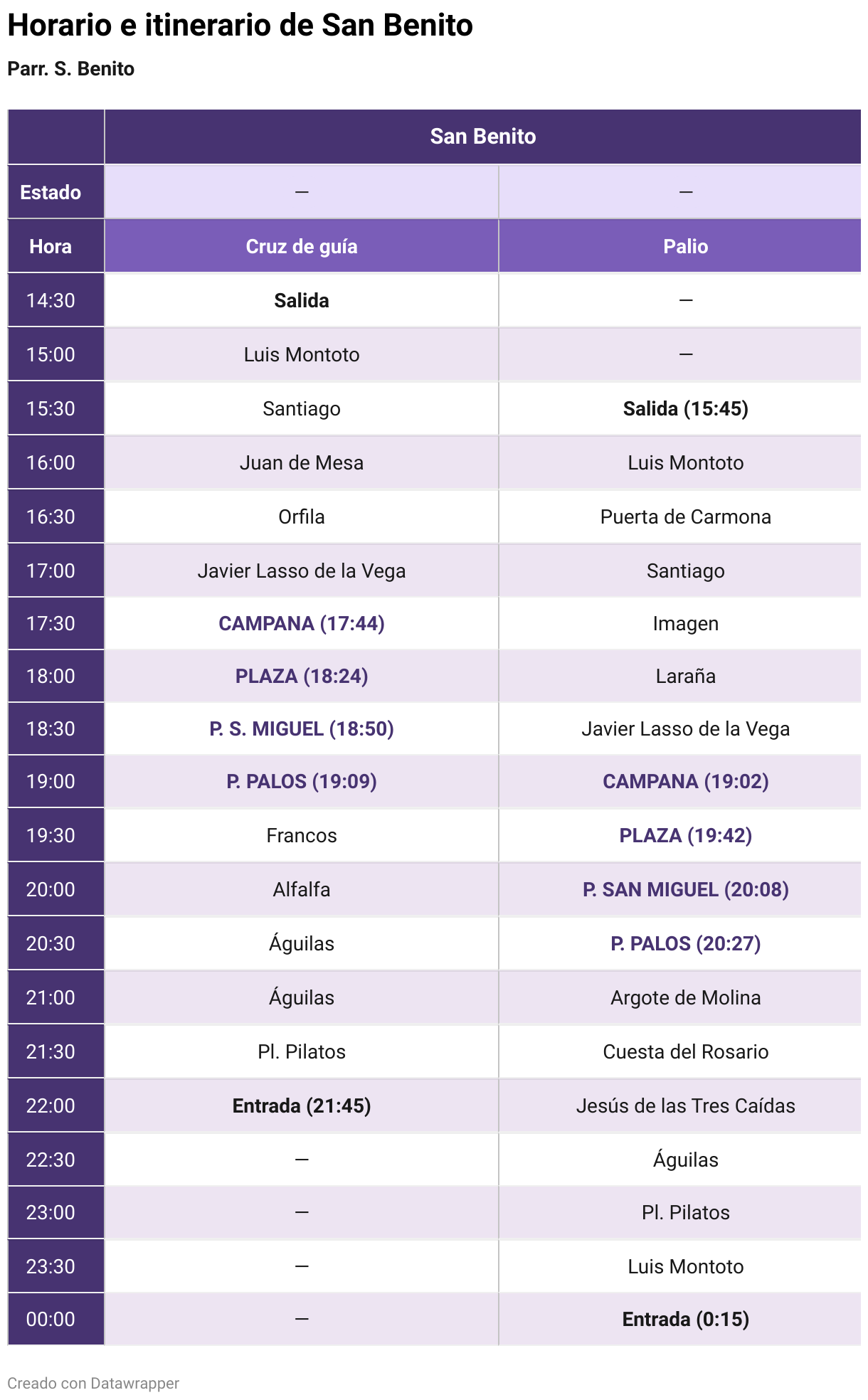 Recorrido: San Benito, Luis Montoto, Puerta de Carmona, Muro de los Navarros, Santiago, Juan de Mesa, Almirante Apodaca, plaza de San Pedro, Imagen, plaza de la Encarnación, Laraña, Orfila, Javier Lasso de la Vega, Trajano, plaza del Duque de la Victoria (lado este), CARRERA OFICIAL, Cardenal Carlos Amigo, Alemanes, Álvarez Quintero, Argote de Molina, Placentines, Francos, Cuesta del Rosario, Jesús de las Tres Caídas, Alfalfa, Águilas, Plaza de Pilatos, San Esteban, Puerta de Carmona, Luis Montoto y San Benito.