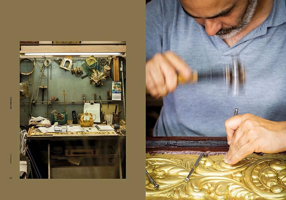 Dentro de la orfebrería se pone en valor la dimensión arquitectónica de la confección de los pasos, un largo proceso que exige una fase inicial de dibujo donde hay que desdoblarse: junto al dibujo artístico que defina la belleza de la pieza, hay que sumar otro de carácter técnico que solvente su composición estructural hasta el mínimo detalle. También se detiene el libro sobre la figura del gran renovador del oficio, Cayetano González Gómez, quien precisamente da ese carácter arquitectónico a un oficio que por otro lado sigue funcionando golpe a golpe, con la máxima precisión.