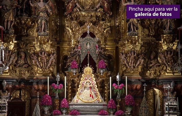 El dosel del montaje lo conforma el retablo. En la parte baja, El Simpecado y la Virgen ante un imponente exorno floral que completa este montaje que figura en el presbiterio de la Colegial del Divino Salvador. Una estampa no habitual, pero que se recordará por ser el altar de una de las crisis sanitarias más duras de la sociedad en las últimas décadas.