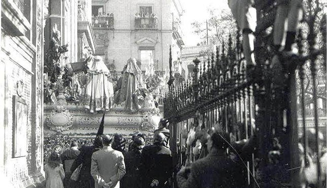 El Cristo del Amor saliendo del Salvador el Martes Santo de 1945 / ABC Tras el Señor del Amor, la Virgen del Socorro procesionaba bajo el antiguo palio de malla de Hijos de Miguel del Olmo realizado en 1939 y que formó parte del patrimonio de esta cofradía gasta 1966, cuando fue vendido al Descendimiento de Carmona. Los respiraderos del paso en aquella tarde eran aún los que Cayetano González proyectó en 1930 y que años después pasaron a formar parte del palio de la hermandad de Jesús Despojado.