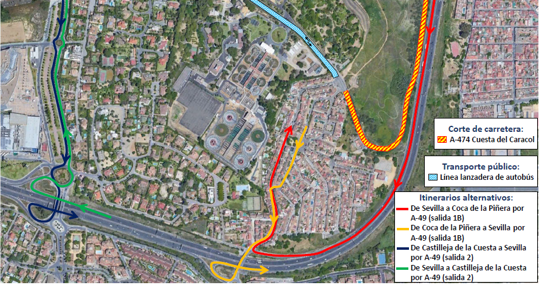 El tráfico sentido Camas/Sevilla procedente de Castilleja de la Cuesta se desvía de la carretera A-474 a la carretera SE-3403 en la rotonda de Inés Rosales , por la que se accederá a la autovía A-49 a través del enlace de Coca de la Piñera-Tomares, entrada 2.