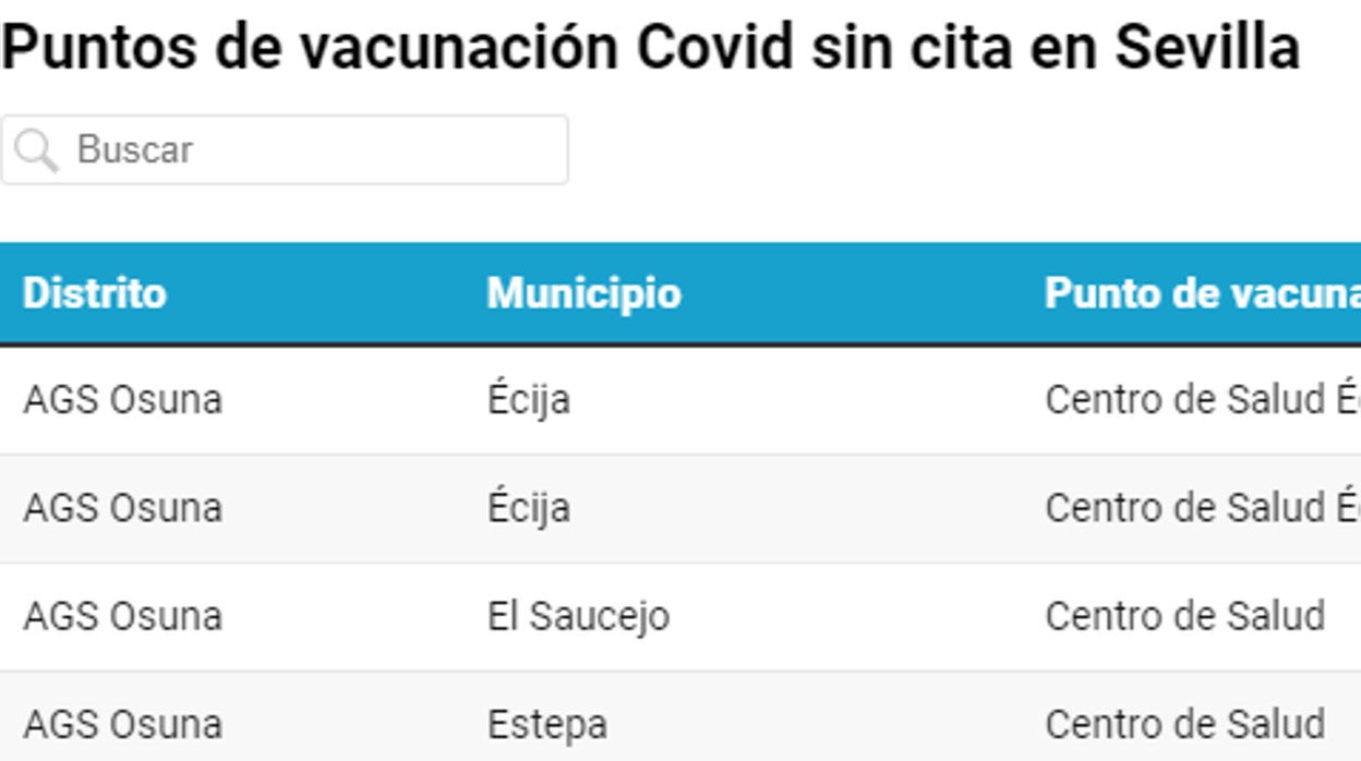 En Sevilla , habrá jornadas de vacunación sin cita en Écija, El Saucejo, Estepa, La Luisiana, Marchena, Osuna, Puebla de Cazalla, Alcalá de Guadaíra, Dos Hermanas, Utrera, Cantillana, Camas, Mairena del Aljarafe y Sevilla capital (en la sede del Distrito Sanitario Sevilla y en el Hospital de Valme).