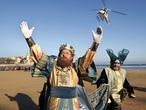 Los Reyes Magos llegaron a Gijón en helicóptero. En la fotografía, el rey Gaspar saluda a los niños tras descender del helicoptero que les transportó hasta la playa de San Lorenzo. Melchor, Gaspar y Baltasar han decidido repetir experiencia y acercarse otro año a Gijón por aire, después de décadas de llegar al puerto local a bordo de la embarcación «Estrella de Oriente»