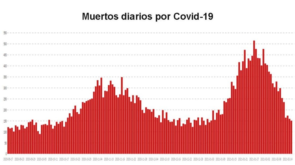 Sin embargo, desde el 4 de octubre todos los días se han superado ampliamente los 100 fallecidos diarios y durante las últimas semanas (entre el 12 de enero y el 12 de febrero) el registro diario se situó muy por encima de los 200 muertos. De hecho, el 27 de enero se alcanzó la cifra de fallecidos diarios más alta (514) desde el 16 de abril.