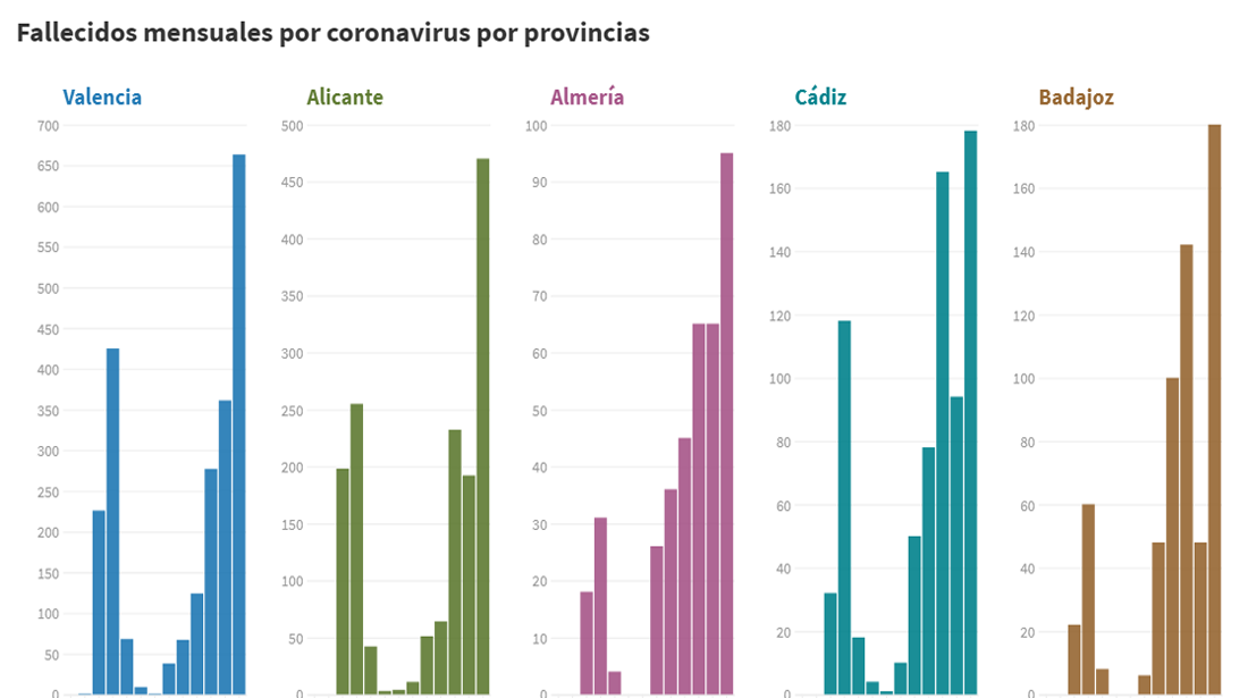 Iniciar sesiónLa tercera ola de coronavirus está siendo especialmente cruenta en cinco provincias españolas que, a falta de que concluya enero, lo sitúan ya como el mes con más muertes de toda la pandemia. Así, tal y como se observa en el ... gráfico superior, elaborado con datos del Centro Nacional de Epidemiología , las provincias de Alicante, Almería, Badajoz, Cádiz y Valencia están afrontando ahora sus peores momentos.