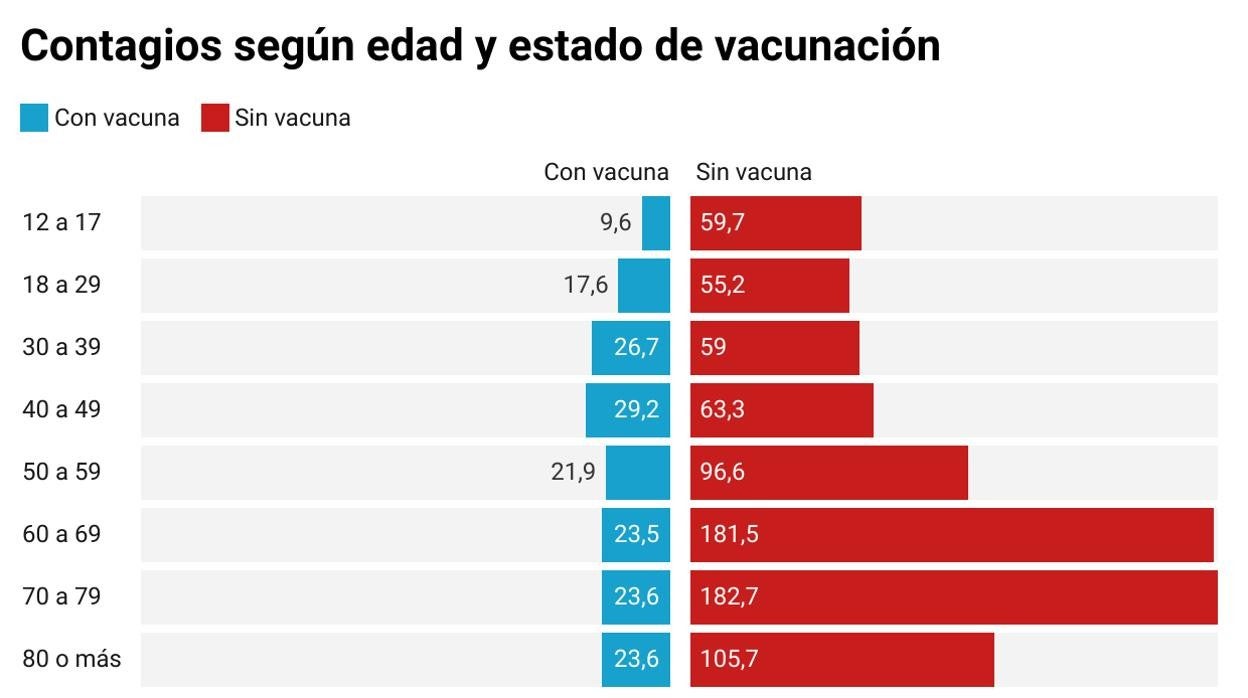 La tasa de ingreso en Unidades de Cuidados Intensivos de una persona sin vacunar de 12 a 30 años es de 0,1, y el de una persona de 30 a 59 años es 0,6, mientras que en ambos grupos la tasa es cero para los vacunados. La tasa de fallecidos de personas sin vacunar de 60 a 79 años es 2,5 mientras que para los vacunados de la misma edad es 0,1.