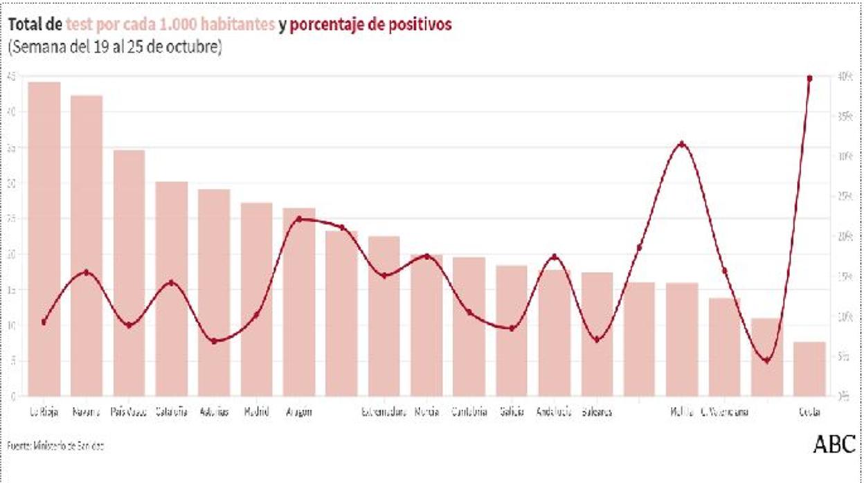No obstante, ese porcentaje medio difiere mucho de unos territorios a otros. Así, Ceuta con un 39,8% de postivos llega casi a triplicar ese índice . Por detrás, Melilla (31,5%), Aragón (22,1%) y Castilla y León (21,1%).