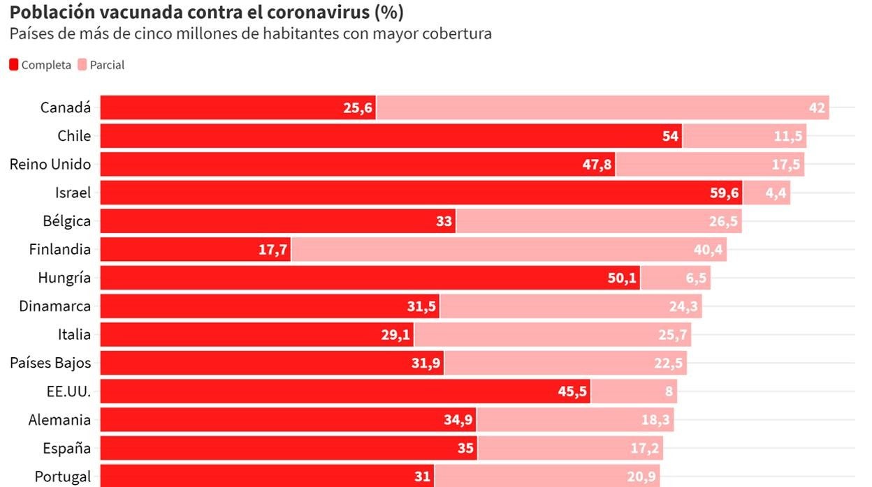 España ya ha cubierto al 35,0% de la población con la vacuna completa, y el 51,3% tiene al menos una dosis, según los datos hasta el 27 de junio de 'Our World in Data', el proyecto estadístico de la Universidad de Oxford que permite la comparación entre países. El porcentaje está próximo a la media de la UE, con el 31,2% con toda la pauta y el 49,4% con al menos un pinchazo. Bélgica, Italia, Países Bajos y Alemania cuentan con un porcentaje de población protegida ligeramente mayor; mientras que Francia, Portugal y Austria están ligeramente por debajo.