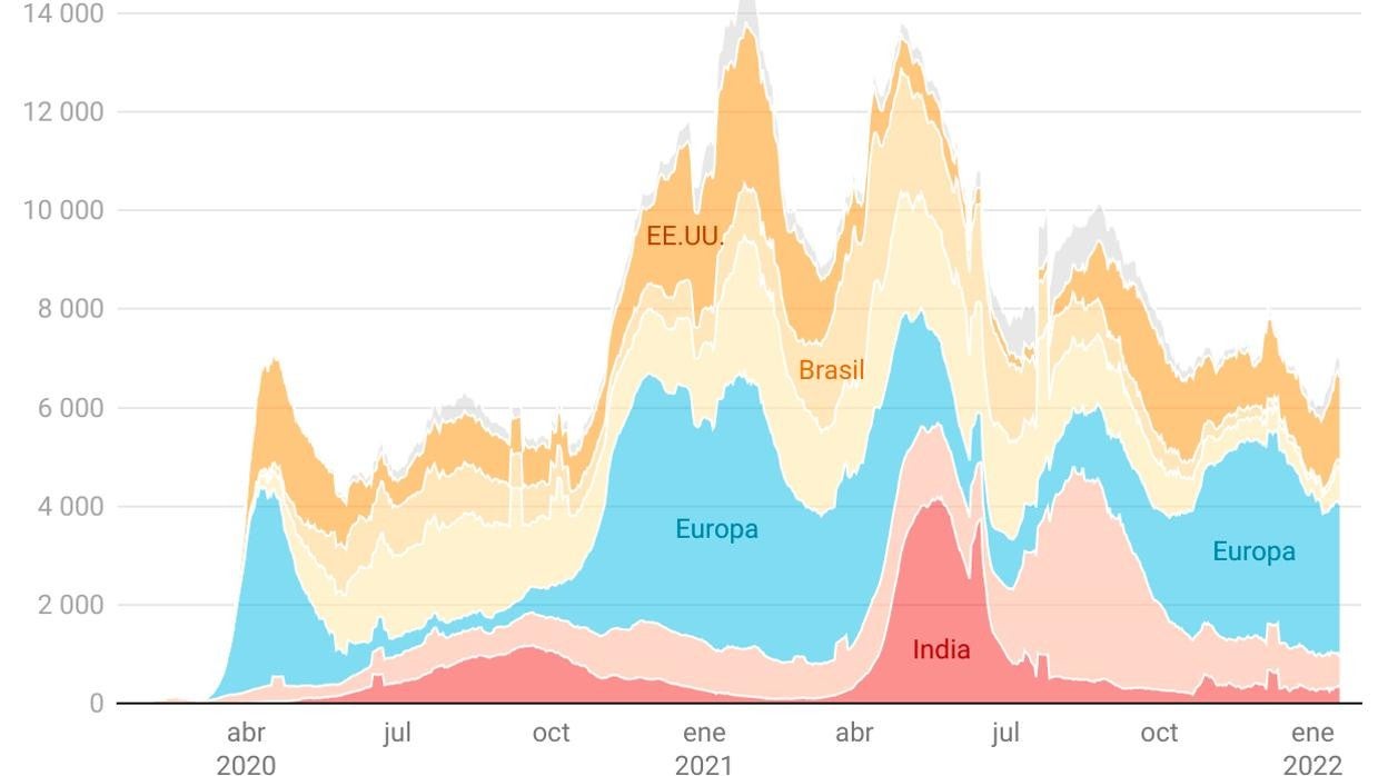 La pandemia está lejos de desaparecer en el mundo. Cada día mueren de media más de 7.000 personas a causa del Covid-19, una cifra que se mantiene relativamente estable, después de haber tocado suelo el pasado año no mucho más abajo, 6.800 a mediados de octubre. El techo mundial está en 14.500 muertes diarias a finales de enero de 2021, el doble que un año después.