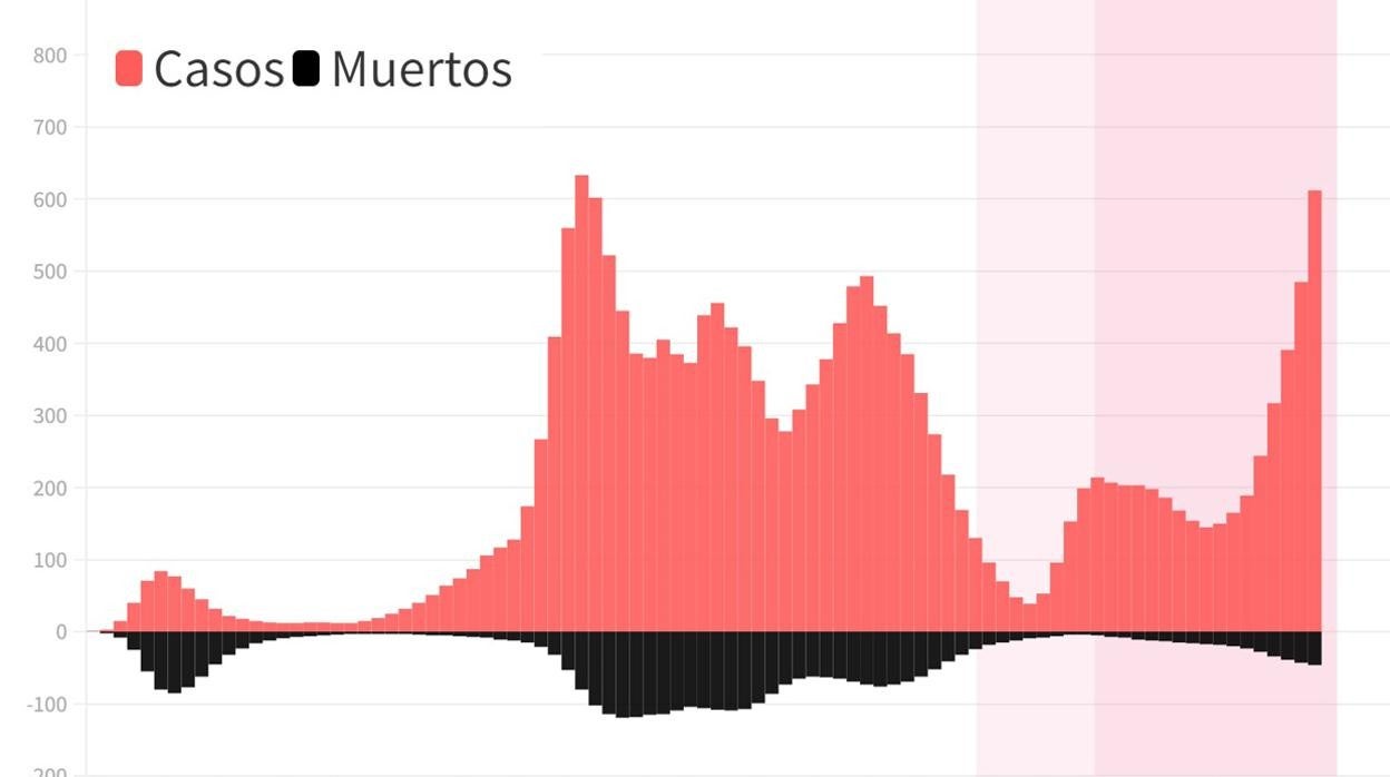 La incidencia acumulada en el conjunto de la UE está en 612 casos por cada 100.000 habitantes en los últimos 14 días, según los datos semanales del Centro Europeo para la Prevención y el Control de Enfermedades (ECDC). En noviembre de 2020 se alcanzó una incidencia de 633, pero la cifra será superada esta ola, según marca la tendencia de la actualización diaria de los datos de la Universidad de Oxford.