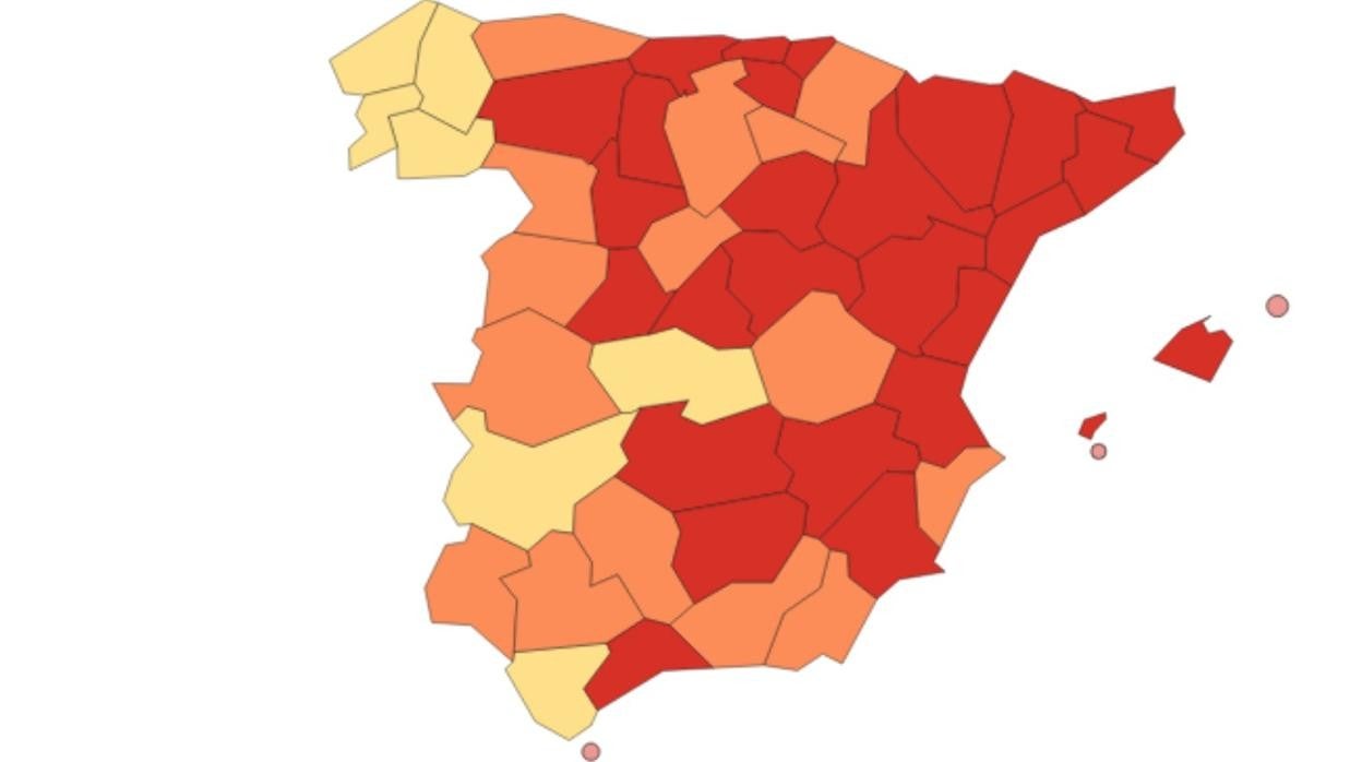 El nivel de alerta general, el cómputo de los indicadores de contagios y de asistencia sanitaria, es muy alto en 28 provincias, dos más que la semana anterior. La situación, por tanto, apenas ha variado. Se han sumado Jaén, Málaga y Murcia, y tan solo ha salido Navarra, ahora en riesgo alto. Se mantienen en el máximo nivel de alerta todas las provincias de Cataluña, Aragón, País Vasco y Canarias, Comunidad de Madrid, Baleares, Cantabria, Castellón, Valencia, Guadalajara, Albacete y Ciudad Real, León, Palencia, Valladolid, Ávila y Soria. Toda Galicia está en riesgo medio, además de Badajoz, Cádiz y Toledo.