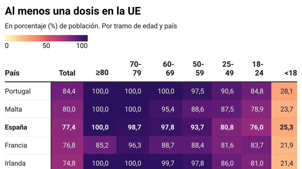 España es uno de los países con mayor cobertura actualmente, el 77,4% de la población con al menos una dosis, según datos del ECDC, que permite la comparación entre países comunitarios. Tan solo Portugal, con un 84,4% con al menos un pinchazo, y Malta (80,0%), tienen actualmente una porción mayor de población protegida.