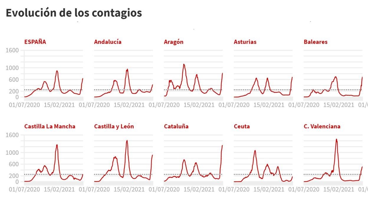 Aragón, Navarra y País Vasco vivieron su incidencia más alta durante la segunda ola, el otoño pasado. La mayoría de comunidades autónomas, no obstante, lo hicieron durante la letal tercera ola, en invierno. Así ocurrió en Andalucía, Castilla-La Mancha, Castilla y León, Comunidad Valenciana, Extremadura, Galicia, Región de Murcia, Comunidad de Madrid y La Rioja.