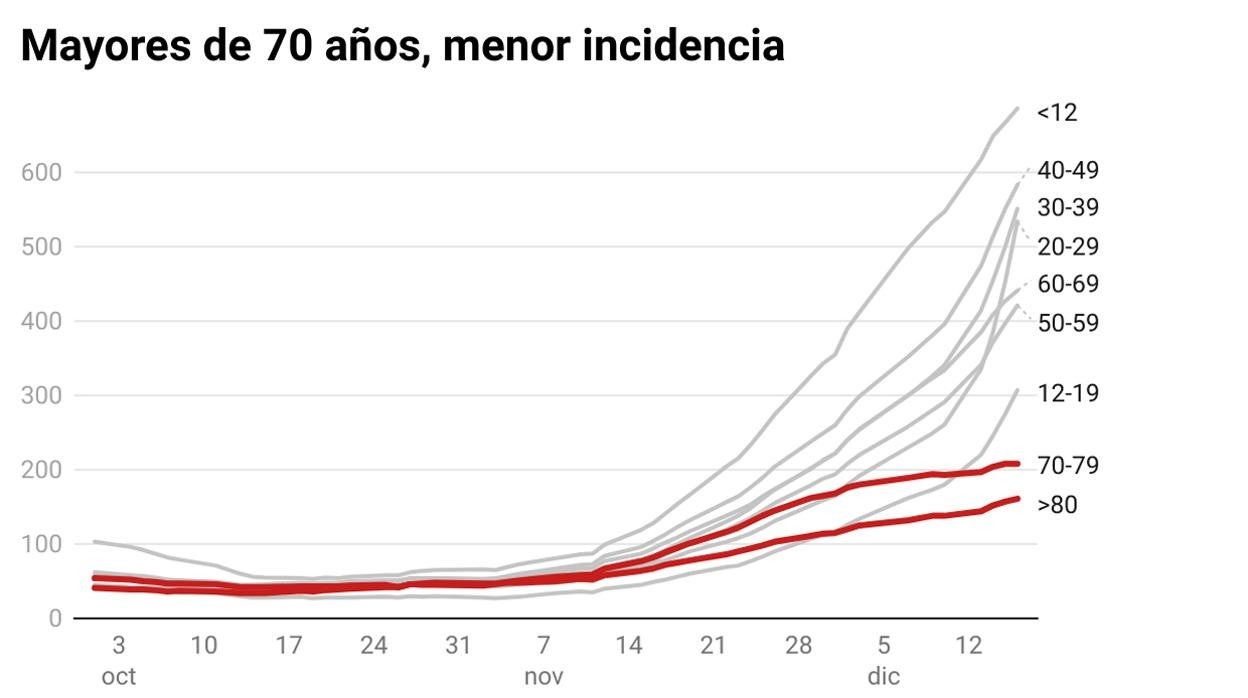 El reaseguro está marcando diferencias entre los mayores de 70 años y el resto de franjas de edad. Su tasa de contagios no siempre ha sido inferior a la de otros grupos también vacunados. A finales de septiembre, de hecho, era superior a otras franjas; una situación que aceleró el plan de inyectar la tercera dosis a la población más vulnerable. Inoculados por primera vez al comienzo de la campaña, ya habían pasado seis meses desde su segunda dosis. Desde finales de octubre comenzaron a recibir el refuerzo, y, desde noviembre, el ascenso de su incidencia no está sufriendo la explosividad del resto de grupos.