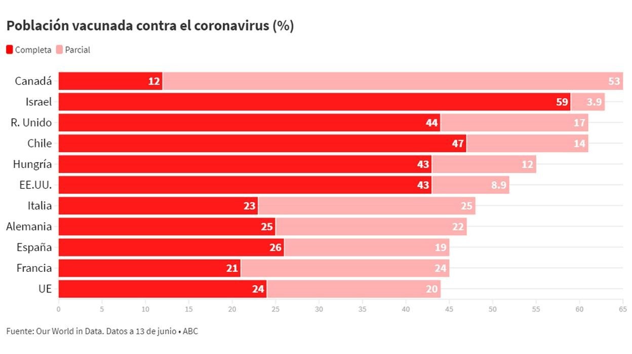 Reino Unido, que durante toda la campaña de vacunación ha ido por detrás de Estados Unidos, lo ha superado recientemente, y ya cuenta con un 44% de la población completamente vacunada, según los datos de 'Our World in Data', de la Universidad de Oxford, que permite la comparación entre países.