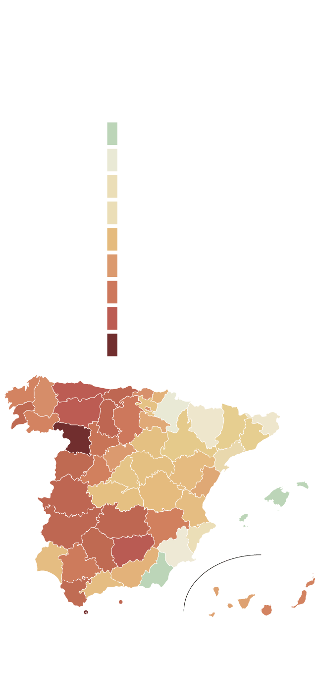 El estudio realizado por Lucas Gortázar y Jorge Galindo repasa también que ocurrirá por provincias. Otra vez, comparando la población de 0 a 15 años durante desde el pico de 2013 hasta 2037, «las caídas más pronunciadas se concentran en Castilla y León (Zamora alcanza al 44%, León o Palencia alrededor de un tercio) y otras provincias del interior (Jaén, Albacete) o del norte (Asturias)». Por contra, hay otras provincias con municipios de tamaño medio que presentan «un escenario de mantenimiento» como es el caso de Alicante, Navarra y Murcia o «incluso de repuntes positivos» como Almería y Baleares.