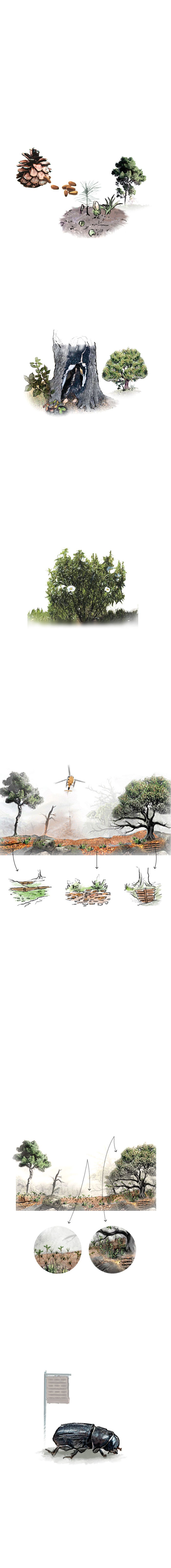 Mientras, las piñas, que han protegido los piñones, se irán abriendo en los tres primeros meses. Los que germinen podrían llegar a los 10 cm de altura en primavera. Los robles activarán reservas guardadas en la raíz (donde los efectos del fuego habrán sido menores) y el tronco para rebrotar. En primavera, podrían tener entre 10 o 12 rebrotes de entre 50 o 60 cm. En cuestión de meses, el terreno mostrará vida. Pero durante el primer lustro el bosque seguirá en recuperación. El humus y el suelo no estarán restablecidos. Especies de las que antes se sacaba provecho, como los boletus y los níscalos, no prosperarán hasta que pasen cinco o seis años.