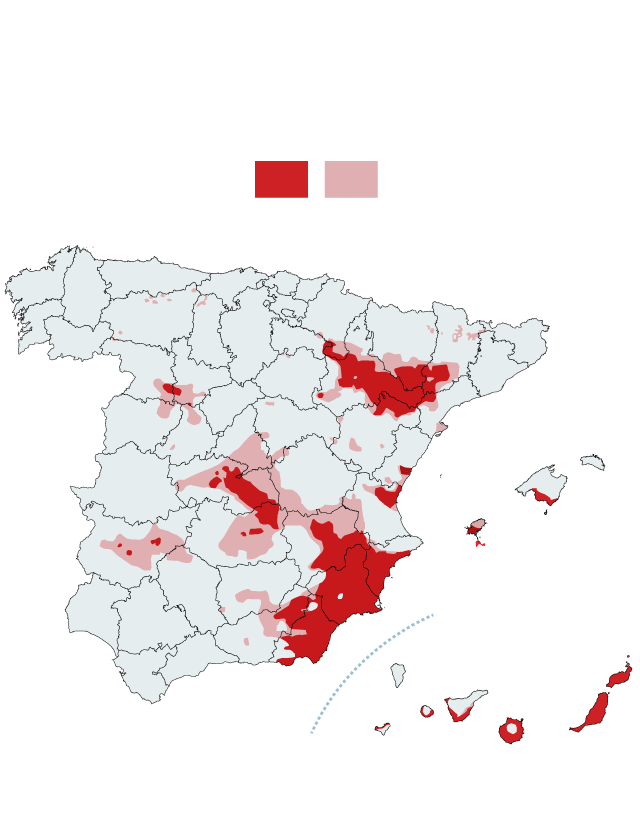«Cada cinco años, una extensión equivalente a la de la provincia de Málaga adquiere un clima árido en nuestro país», ha explicado la Aemet. Si en los años 50 había dos zonas áridas claramente separadas en España en la meseta sur y el sureste peninsular, estas se han ido expandiendo hasta formar, a partir de los años 70, una misma extensa zona árida. Ahora, este clima con déficit hídrico predomina en zonas del sur de la Comunidad de Madrid, donde antes no se daba. También áreas de Castilla-La Mancha, la provincia de Badajoz, este de Andalucía, suroeste de Castilla y León y entorno de la depresión del Ebro.