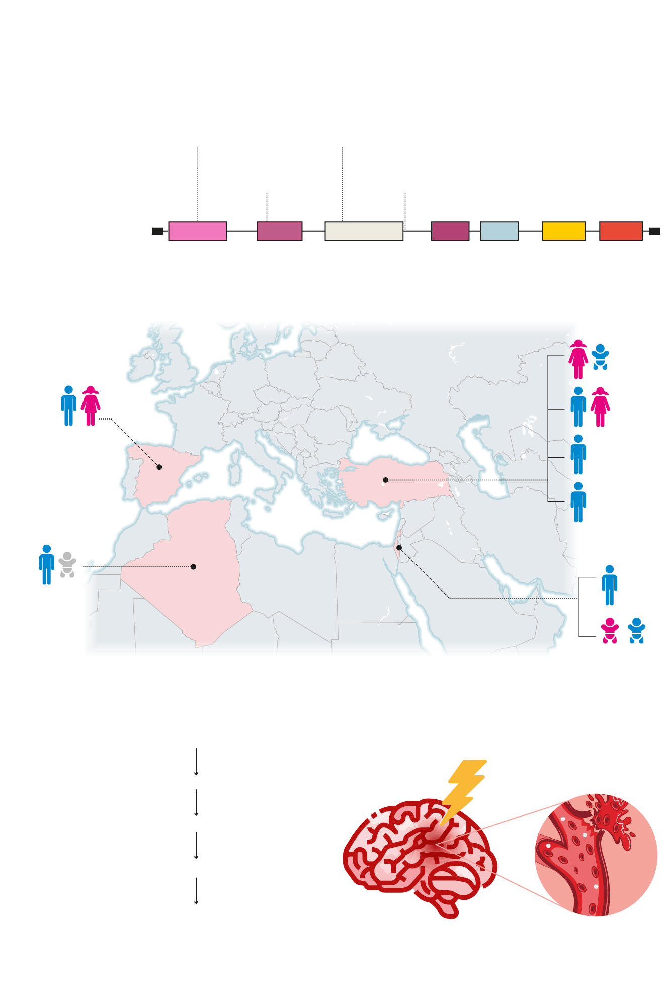 8 familias en todo el mundo: Hay 13 pacientes de ocho familias en todo el mundo. De Turquía, Israel y Argelia. Todos han tenido hemorragias intracraneales en el útero y son niños que nacen con grandes problemas neurológicos.