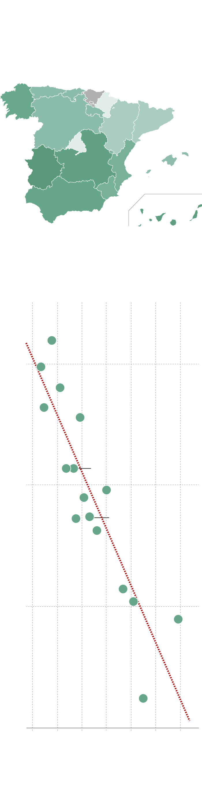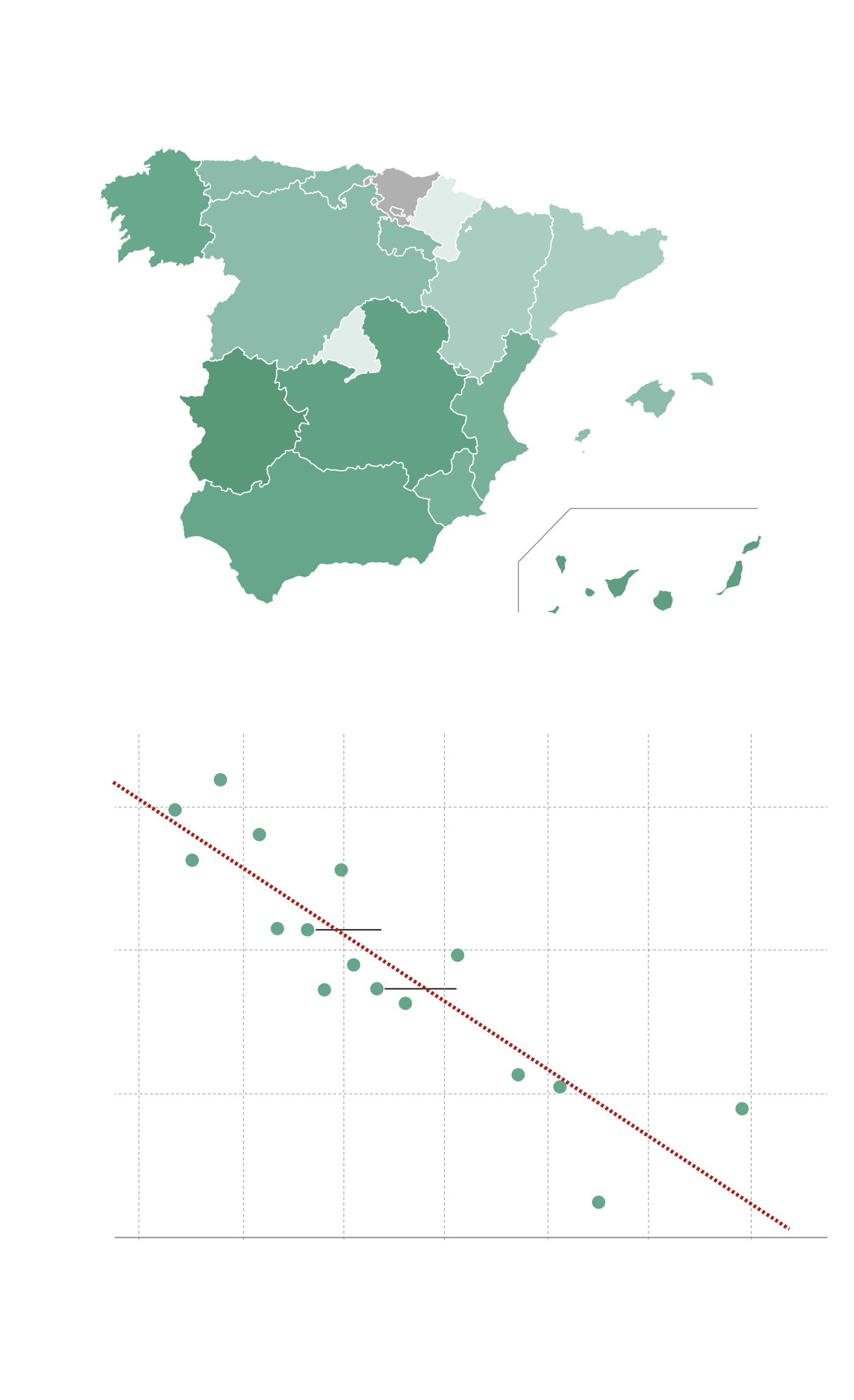 Hay que recordar que las becas universitarias se conceden en función de la situación económica de las familias, medida principalmente a través del nivel de ingresos del año fiscal anterior a la solicitud. Así, la proporción de estudiantes becados varía considerablemente entre comunidades autónomas: en torno al 40% de los estudiantes en Extremadura o Canarias reciben beca, mientras en comunidades como Navarra, Madrid o Cataluña este porcentaje es de menos de la mitad. Además, existe una correlación casi perfecta entre el PIB per cápita de las comunidades autónomas y el porcentaje de estudiantes becarios: a mayor renta per cápita, menor porcentaje de estudiantes con ayuda.