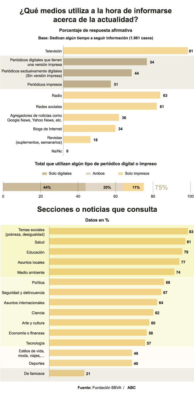 Entre los medios más utilizados para informarse, los periódicos digitales que tienen formato impreso tienen mayor presencia que los exclusivamente digitales. Por detrás, se sitúan la radio y las redes sociales, mientras que los agregadores de noticias apenas aparecen como uno de los medios principales para documentarse. La televisión, por su parte, lidera el ranking.