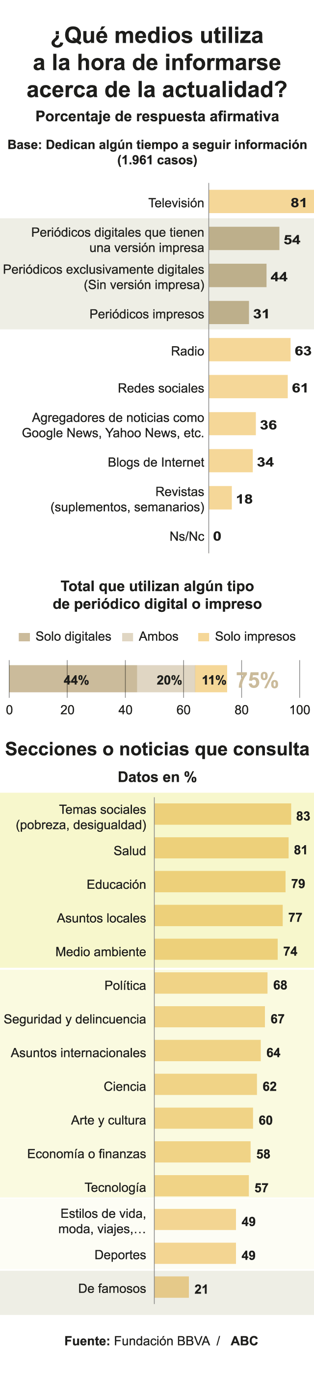 Así lo refleja el «Estudio sobre Pautas de Consumo de Información» realizado por la Fundación BBVA e Imop Insights, que examina el interés y la dedicación al seguimiento de la actualidad, los medios para informarse, así como las pautas en el acceso a la información.