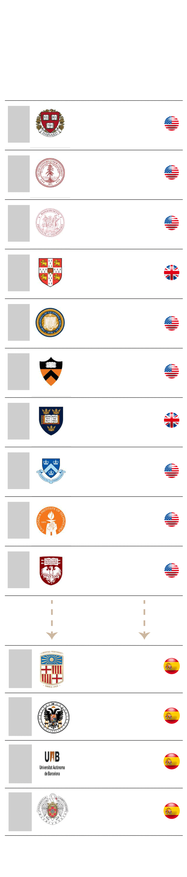 En la franja de las 301-400 mejores instituciones del mundo figuran la Universidad Autónoma de Barcelona, la Universidad Autónoma de Madrid, la Universidad Complutense de Madrid, la Universidad Pompeu Fabra y la Universidad de Valencia.