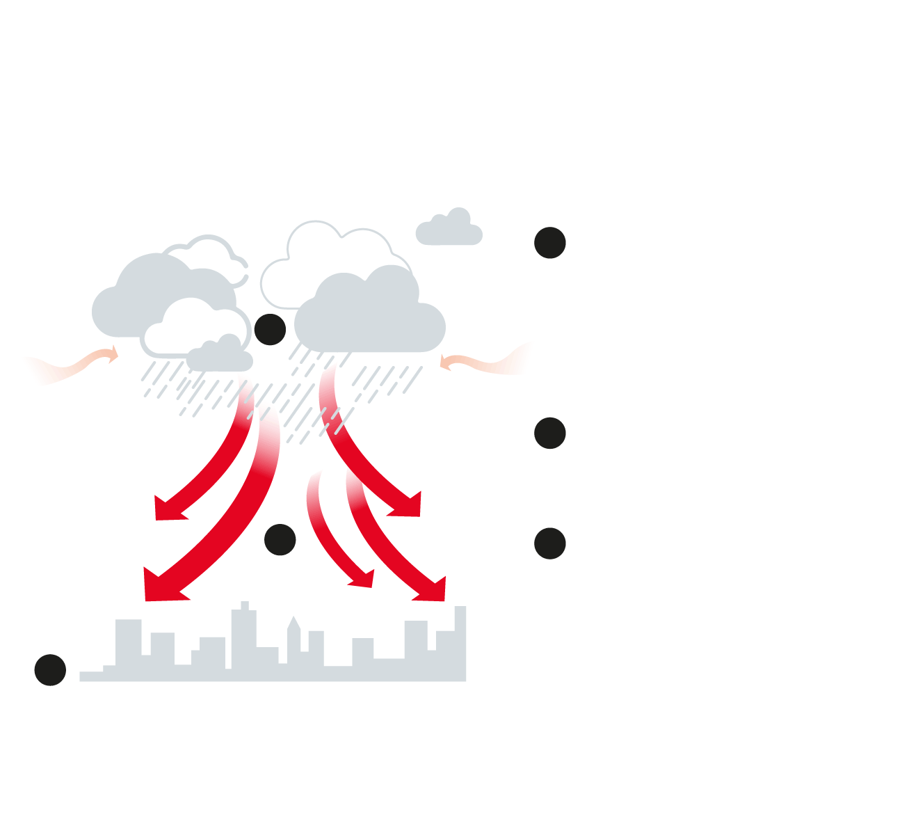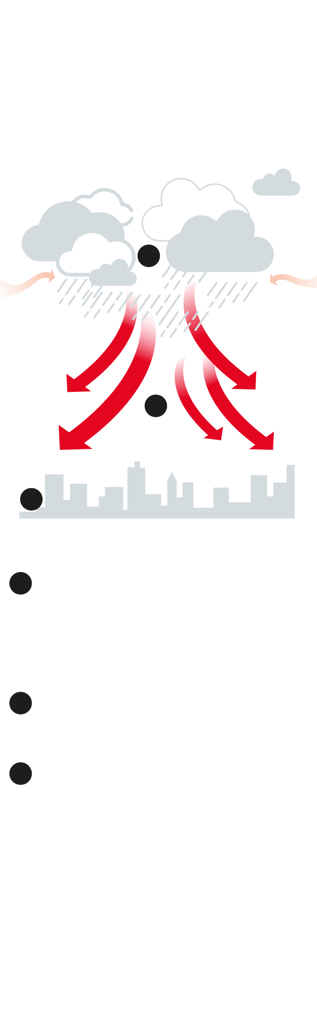 Con tormentas de base alta la precipitación cae a través de una capa de aire seco y se evapora, haciendo que el aire descendente se enfríe y pese más que el circundante