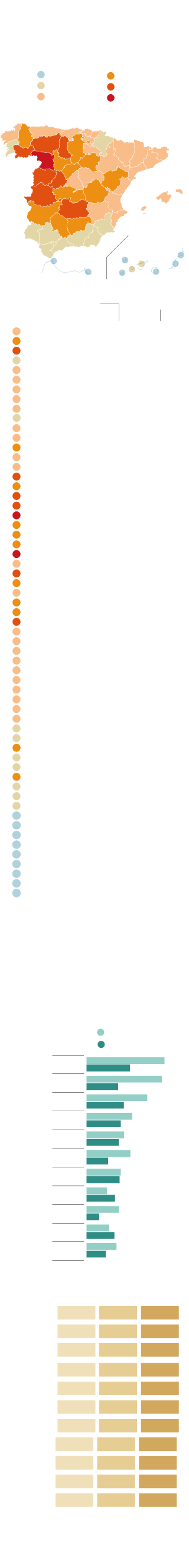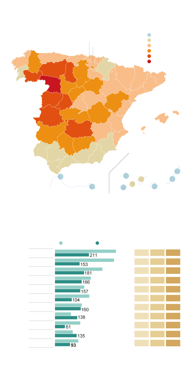 Por provincias, en España, las que registraron más muertes por millón de habitantes fueron Zamora (587), seguido de Orense (466), Cáceres (460), Ávila (436) y Palencia (425), frente a otras regiones como la registrada en la isla de El Hierro o en Fuerteventura, en las que se registraron solo 20 y 42 muertes por cada millón de habitantes, respectivamente. «Las provincias más afectadas fueron las del centro de España, donde las temperaturas son más extremas y hay población más envejecida, aunque podemos decir que el aumento de temperaturas y muertes fue homogéneo en líneas generales», apunta Marcos Quijal.