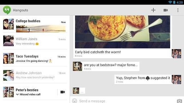 Google lanzó recientemente la aplicación Hangouts tanto para PC como para los sistemas operativos Android e iOS. Se trata de su propia plataforma de mensajería unificada, ya que sustituye a Google Talk, Google+ Messenger y al servicio de Google+ para chats de vídeo. La «app» permite enviar mensajes de texto, voz y vídeo con la posibilidad de realizar también videollamadas.