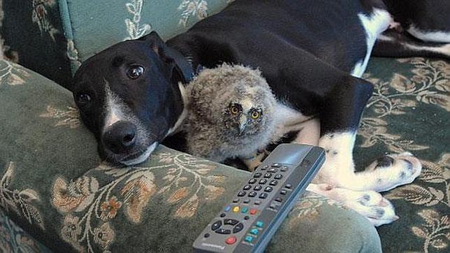 Estos dos colegas, a quienes parecen haber interrumpido mientras echaban una siesta en el sofá viendo un documental, son Torque el perro y el búho Shrek. El ave tuvo que separarse de su madre siendo apenas un polluelo, pero no tardó en hacer buenas migas con el cachorro que vivía en casa de su familia adoptiva. Pasado el tiempo, la amistad continúa.