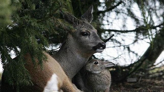 Este ciervo y este conejo, fotografiados en un bosque viviendo en libertad, podrían perfectamente ser Tambor y Bambi, el conejo y el ciervo que protagonizan la película infantil. Ambos tienen claro que en la inmensidad de los bosques viene bien tener alguien con quien compartir los ratos muertos.